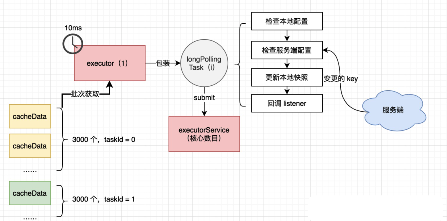 ClientWorker 通过其下的两个线程池完成配置长轮询的工作,一个是单线程的 executor,每隔 10ms 按照每 3000 个配置项为一批次捞取待轮询的 cacheData 实例,将其包装成为一个 LongPollingTask 提交进入第二个线程池 executorService 处理。